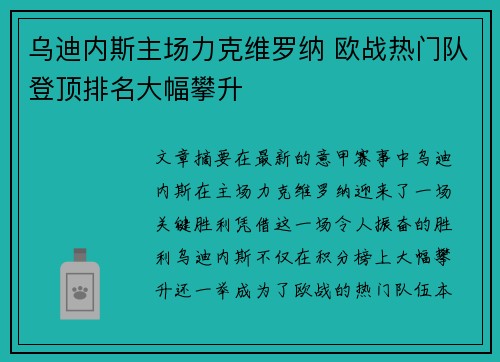 文章摘要:在最新的意甲赛事中,乌迪内斯在主场力克维罗纳,迎来了一场关键胜利。凭借这一场令人振奋的胜利,乌迪内斯不仅在积分榜上大幅攀升,还一举成为了欧战的热门队伍。本文将从四个方面详细分析乌迪内斯如何通过这一胜利攀升至更高的排名,并探讨他们在欧战竞争中的前景。首先,文章将分析乌迪内斯主场强势取胜的战术布置;接着,讨论球队在赛季中的进步和核心球员的表现;然后,分析这一胜利如何提升球队士气,增强其竞争力;最后,文章将探讨乌迪内斯如何通过这一场胜利向欧战席位发起冲击,并展望其未来的发展潜力。